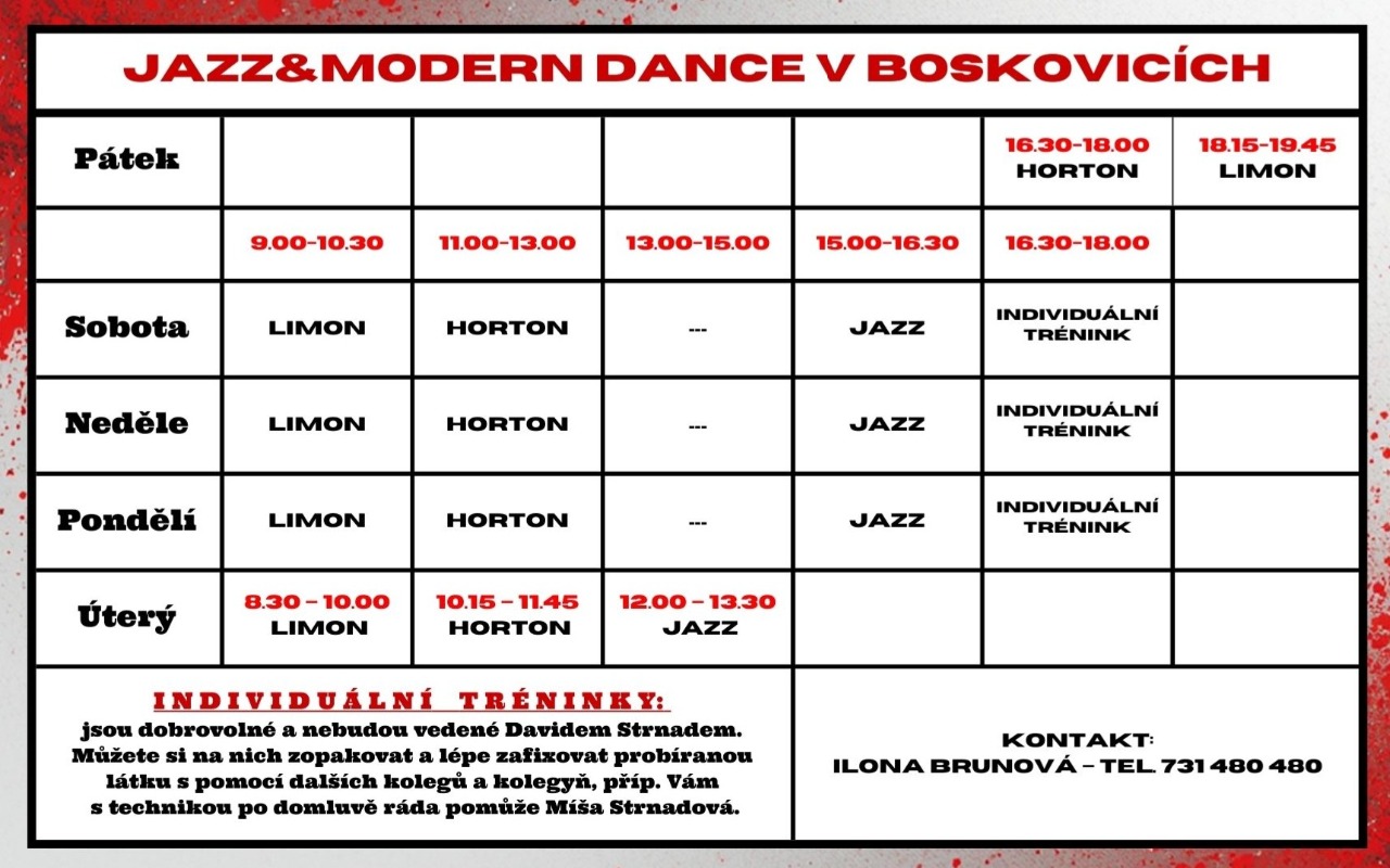 Seminář obsahuje 14 tanečních bloků - tj. tři tréninky denně vedené Davidem Strnadem. Tančit můžete celkem 22,5 hodin - techniku LIMON a JAZZ v 1,5hodinových blocích, techniku HORTON pak nově ve 2hodinových blocích. Taneční bloky technik Limon a Horton na sebe navazují.