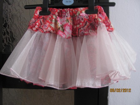 2. strana sukýnky s kytičkami doplněná bílým volánem.